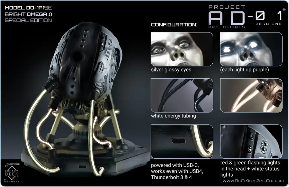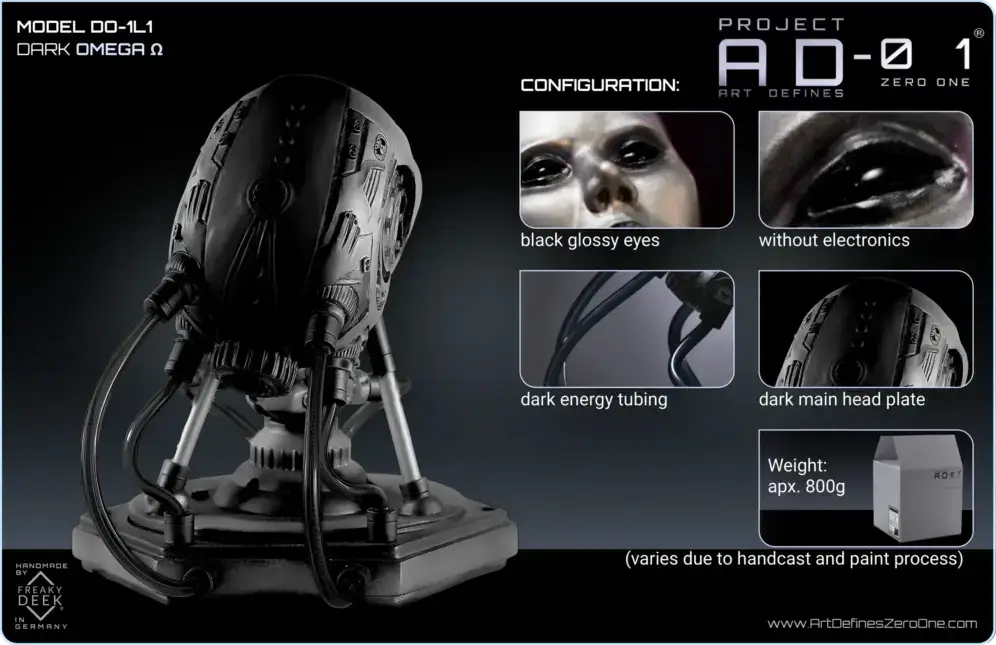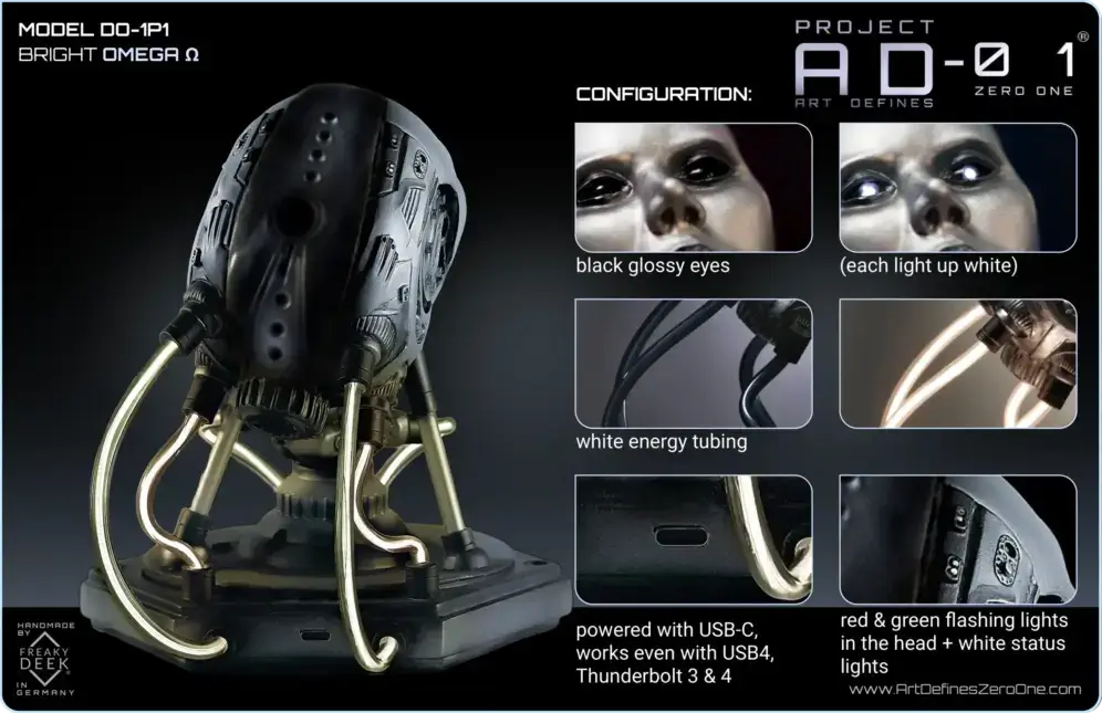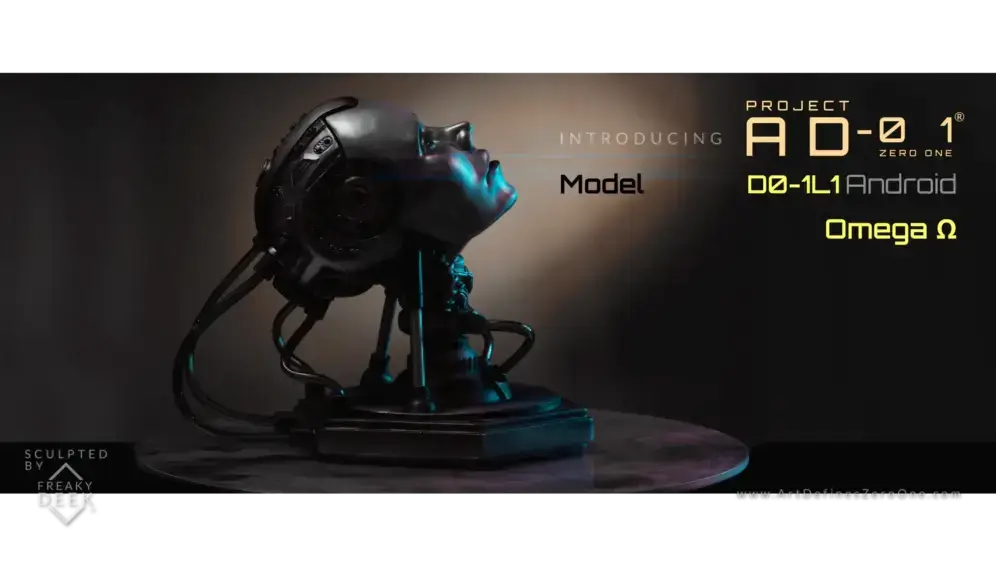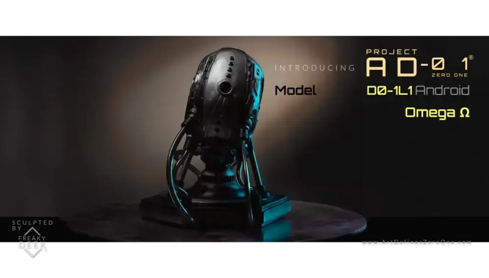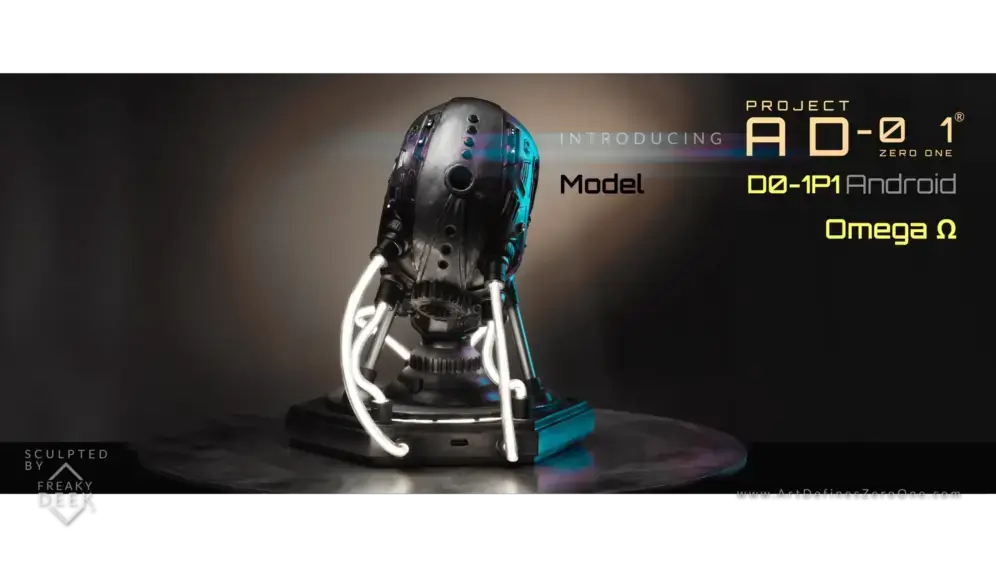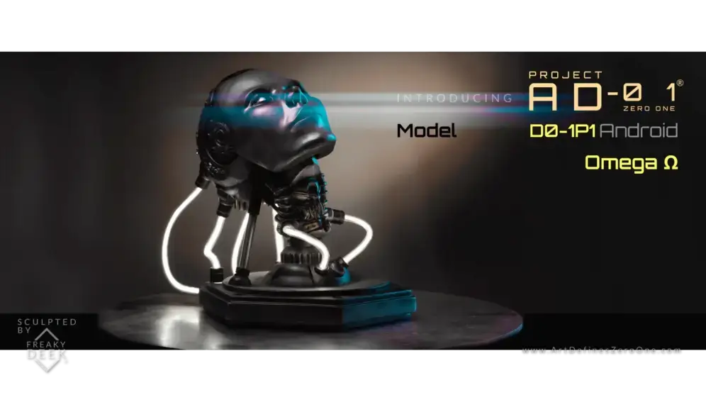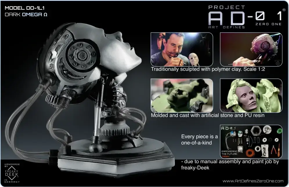Project AD-01’s Omega Ω is a handcrafted android sculpture by artist freaky-Deek, symbolizing the intricate relationship between humanity and technology. Each piece is meticulously sculpted from polymer clay, molded, cast, painted, and assembled by hand, ensuring a unique and personal touch.