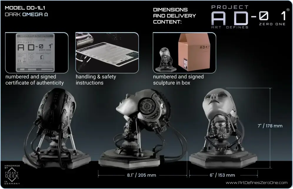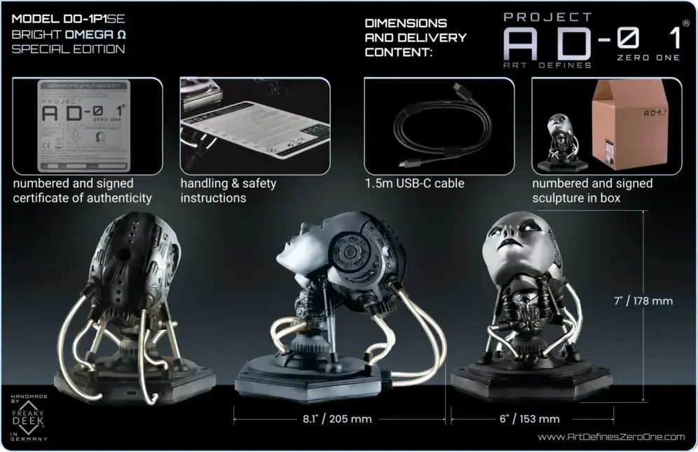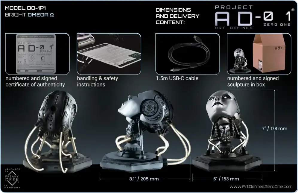 When you get your OMEGA Ω sculpture, it comes with the handmade android bust, plus you’ll get a certificate that’s numbered and signed, some instructions on how to handle it safely, and a USB-C cable if you’ve got one of the electronic versions.
