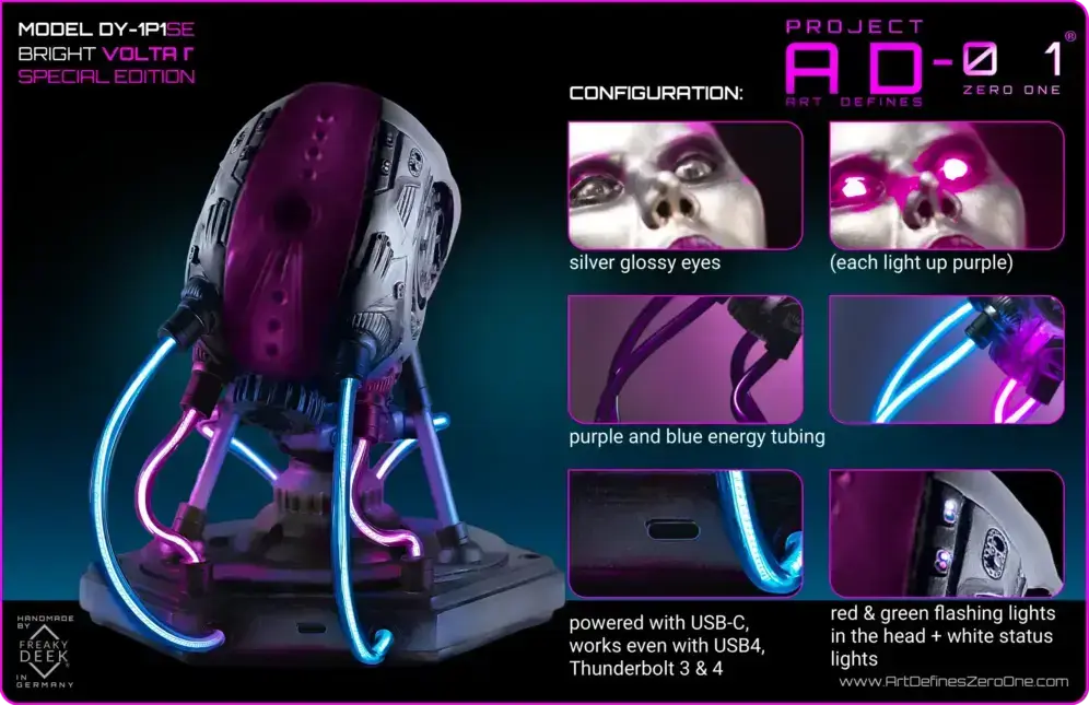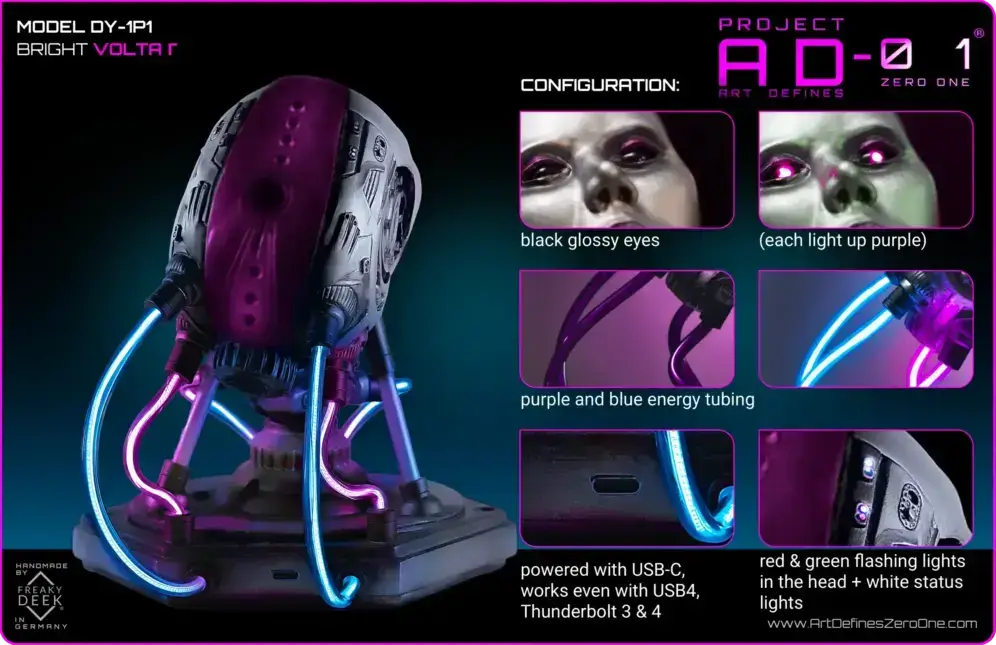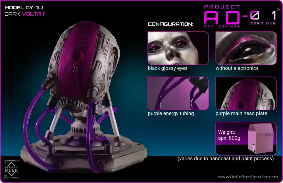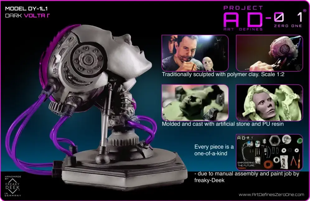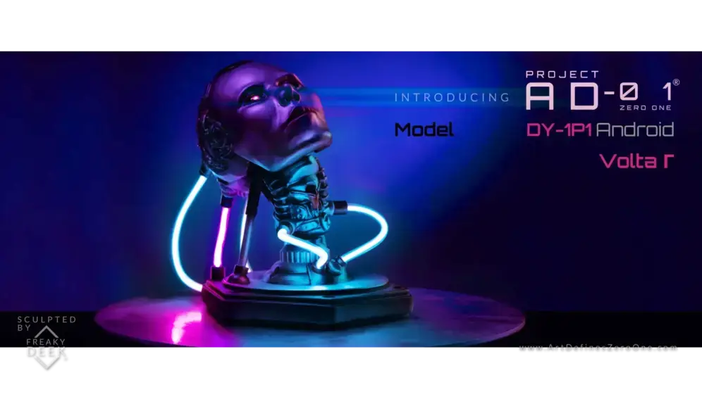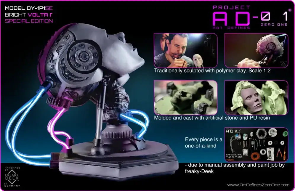 Project AD-01’s VOLTA Γ is an original handcrafted android sculpture by artist freaky-Deek. Each piece is sculpted with clay, molded, cast, painted, and assembled by hand, ensuring an artisanal level of craftsmanship.