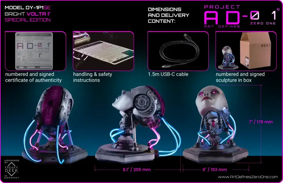 Each VOLTA Γ sculpture comes with a handmade android bust, a numbered and signed certificate of authenticity, handling and safety instructions, and a USB-C cable for electronic models.